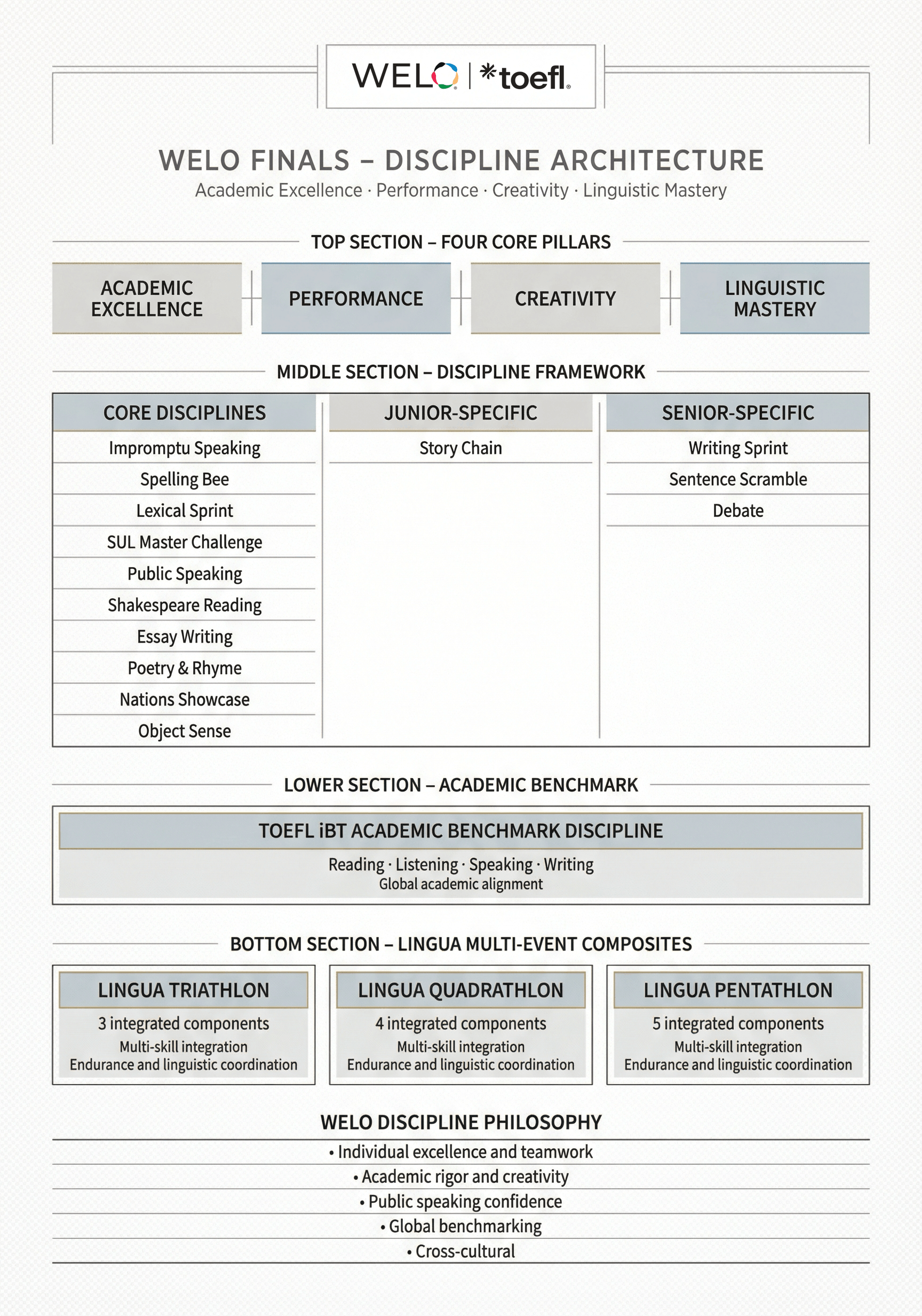 The discipline framework combines individual, team-based, creative, academic, and composite challenges to ensure a complete evaluation of language ability.