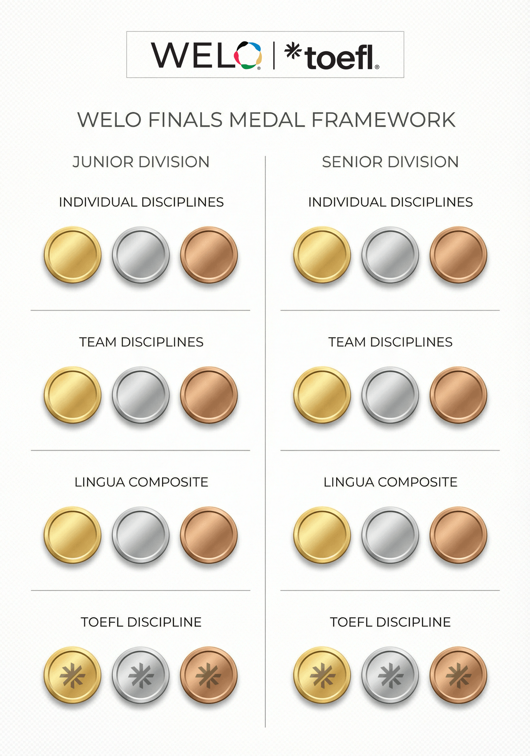 The WELO Medal Structure recognises excellence across individual performance, team collaboration, composite linguistic endurance, and overall national achievement.