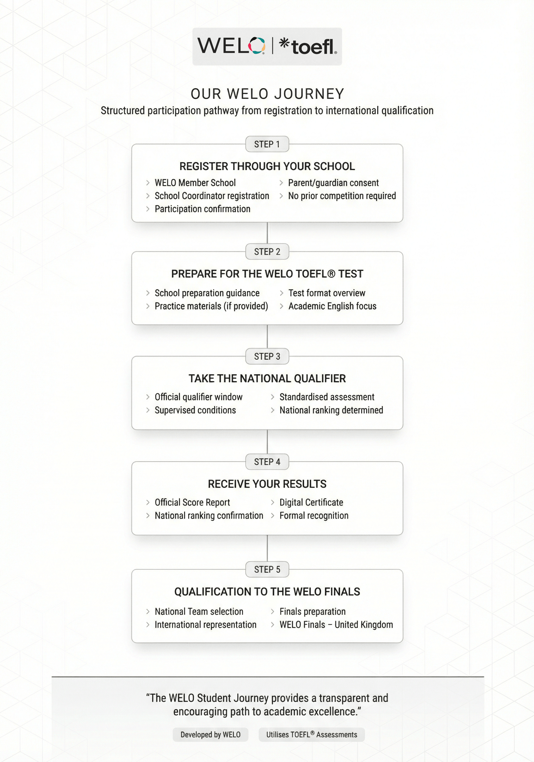 The National Qualifier is delivered through the official WELO TOEFL® test.