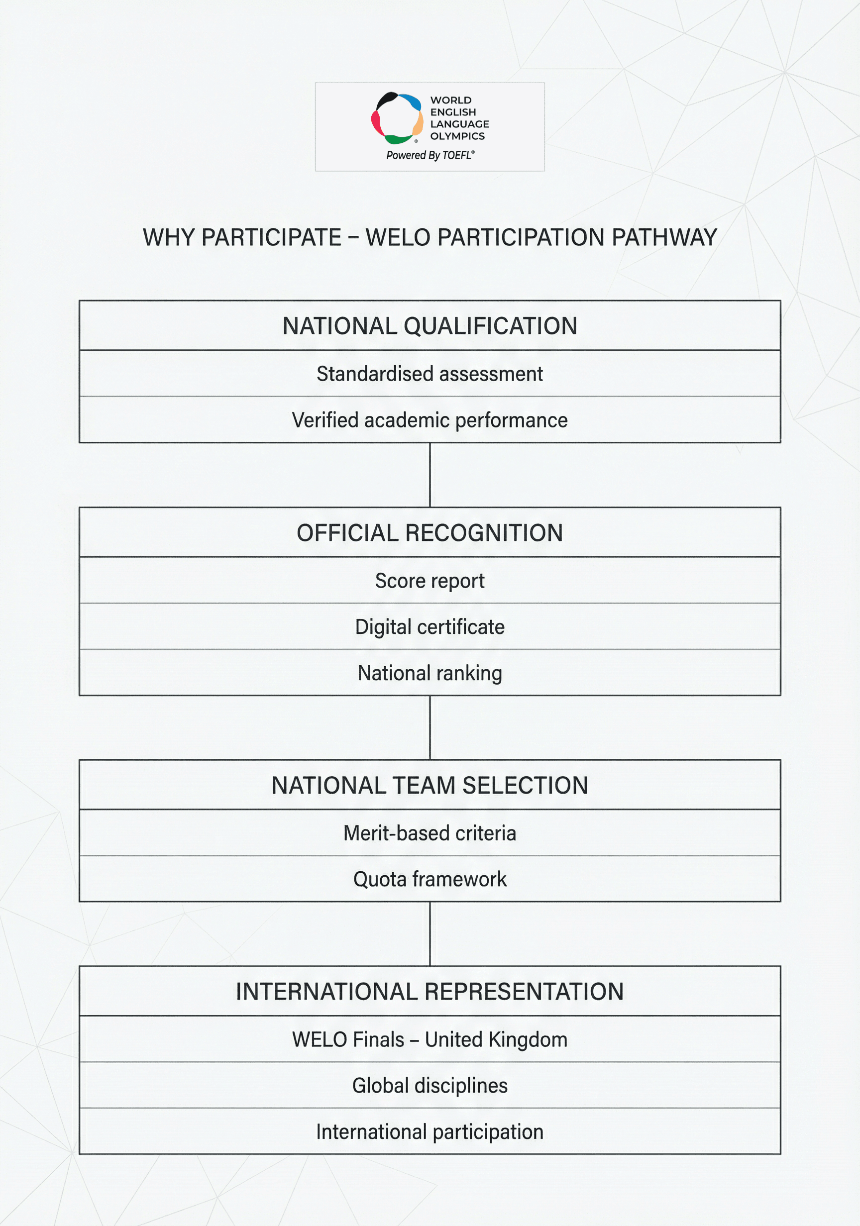 Participation at the WELO Finals reflects excellence achieved through transparent national qualification.